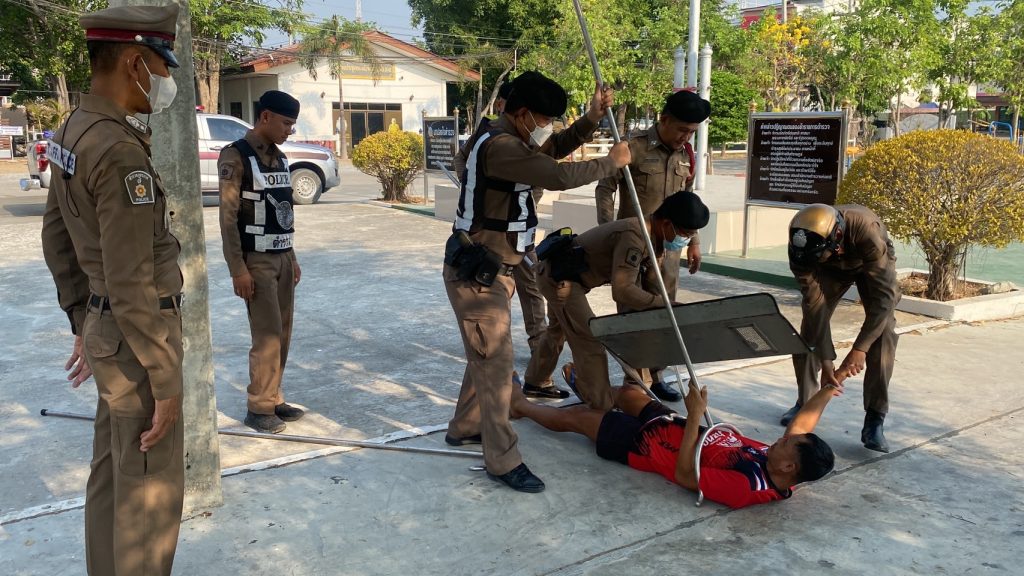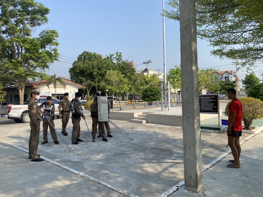 มอบหมายให้ พ.ต.ท.บุญถิ่น พุ่มอ่ำ สวป.สภ.หนองหญ้าไซ สายตรวจรถยนต์ จราจร ข้าราชการตำรวจ สภ.หนองหญ้าไซ ร่วมซ้อมแผนเผชิญเหตุคนบ้าอาละวาด