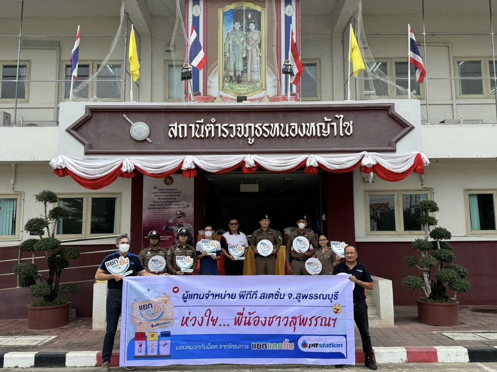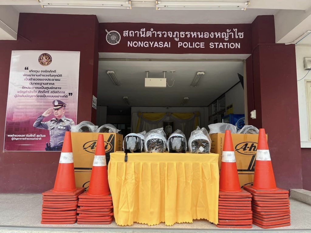 และเจ้าหน้าที่งานจราจร สภ.หนองหญ้าไซ ร่วมรับมอบ หมวกนิรภัย (หมวกกันน็อค) จาก ผู้แทนจำหน่าย พีทีที สเตชั่น จ.สุพรรณบุรี ในโครงการ“แยกแลกยิ้ม” โดยร่วมกับ ผู้ประกอบการธุรกิจน้ำมัน ปตท. อ.หนองหญ้าไซ