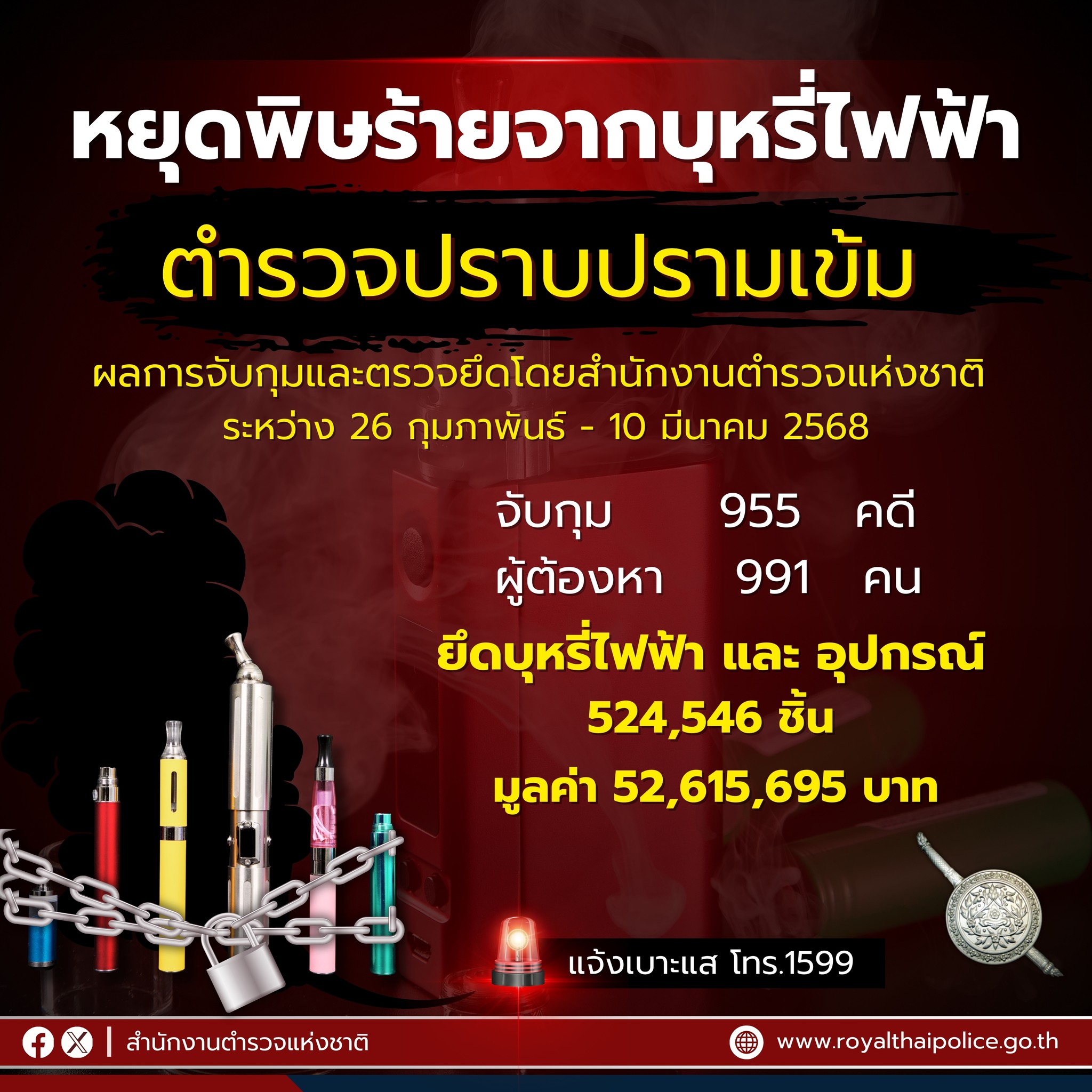 สำนักงานตำรวจแห่งชาติปราบปรามเข้ม จับกุมตรวจยึดอย่างต่อเนื่องกว่า 2 สัปดาห์ ยึดบุหรี่ไฟฟ้าและอุปกรณ์