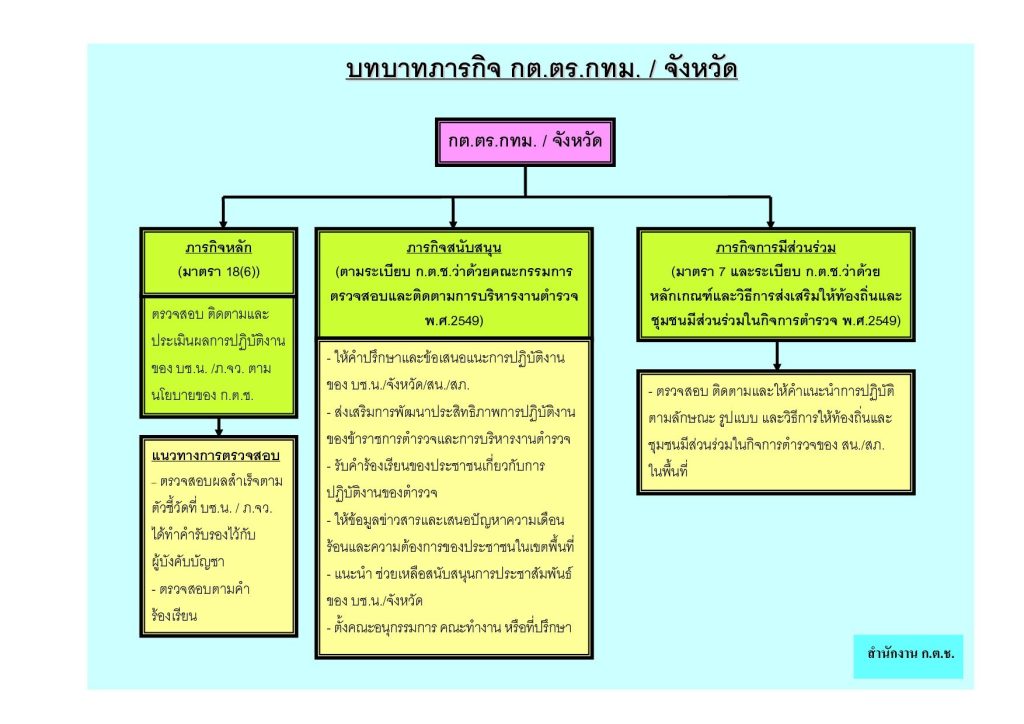 1. ภารกิจหลัก ตามมาตรา 18 (6 แห่ง พ.ร.บ.ตำรวจแห่งชาติ พ.ศ. 2547 กำหนดให้ กต.ตร.กทม. กต.ตร.จังหวัดและ กต.ตร.สถานีตำรวจ มีบทบาทภารกิจในการตรวจสอบ ติดตามและประเมินผลการปฏิบัติงานของ บช.น. / ภ.จว. ให้เป็นไปตามนโยบายของ ก.ต.ช. และการบริหารราชการตำรวจให้เป็นไปตาม พ.ร.บ.ตำรวจแห่งชาติ และกฎหมายอื่น ซึ่ง ก.ต.ช. ได้กำหนดอำนาจหน้าที่ของ กต.ตร.กทม,/จังหวัด และสถานีตำรวจในเรื่องดังกล่าว ไว้ในระเบียบ ก.ต.ช. ว่าด้วยคณะกรรมการตรวจสอบและติดตามการบริหารงานตำรวจ พ.ศ. 2549
